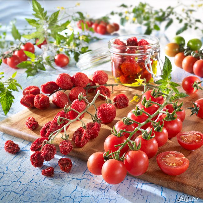 Sie sind die reinsten Geschmackswunder und verzücken uns egal ob roh genascht oder weiterverarbeitet in köstlich mediterranen Gerichten. Damit dieser gesunde und wohlschmeckende Zauber nicht zu schnell vorüber ist, gibt es jetzt die Züchtung 'Arielle'. Die Früchte können einfach an der geernteten Rispen belassen werden und trockenen dann gut durch ohne zu faulen. Die Fruchtschale der Tomaten ist leicht porös, daher ist dieser Vorgang so gut möglich. Der Vorteil ist, dass die Aromen und Nährstoffe bei einer natürlichen Trocknung bewahrt werden und die Tomaten so haltbar gemacht werden und auch noch Wochen nach der Ernte verwendet werden können.