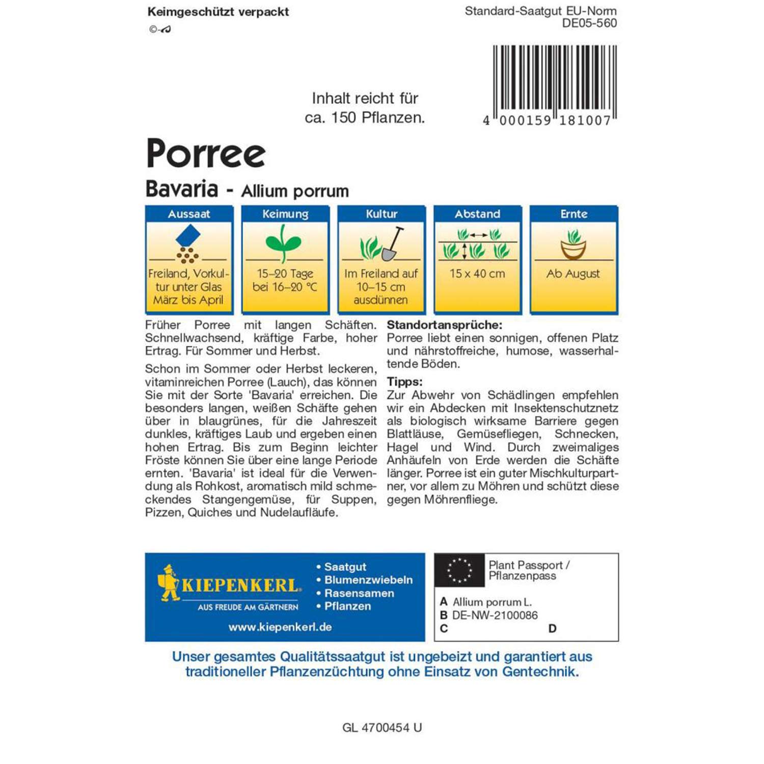 Schon im Sommer oder Herbst leckeren, vitaminreichen Porree (Lauch), das können Sie mit der Sorte Bavaria erreichen. Die besonders langen, weißen Schäfte gehen über in blaugrünes, für die Jahreszeit dunkles, kräftiges Laub und ergeben einen hohen Ertrag. Bis zum Beginn leichter Fröste können Sie über eine lange Periode ernten. Bavaria ist ideal für die Verwendung als Rohkost, aromatisch mild schmeckendes Stangengemüse, für Suppen, Pizzen, Quiches und Nudelaufläufe.