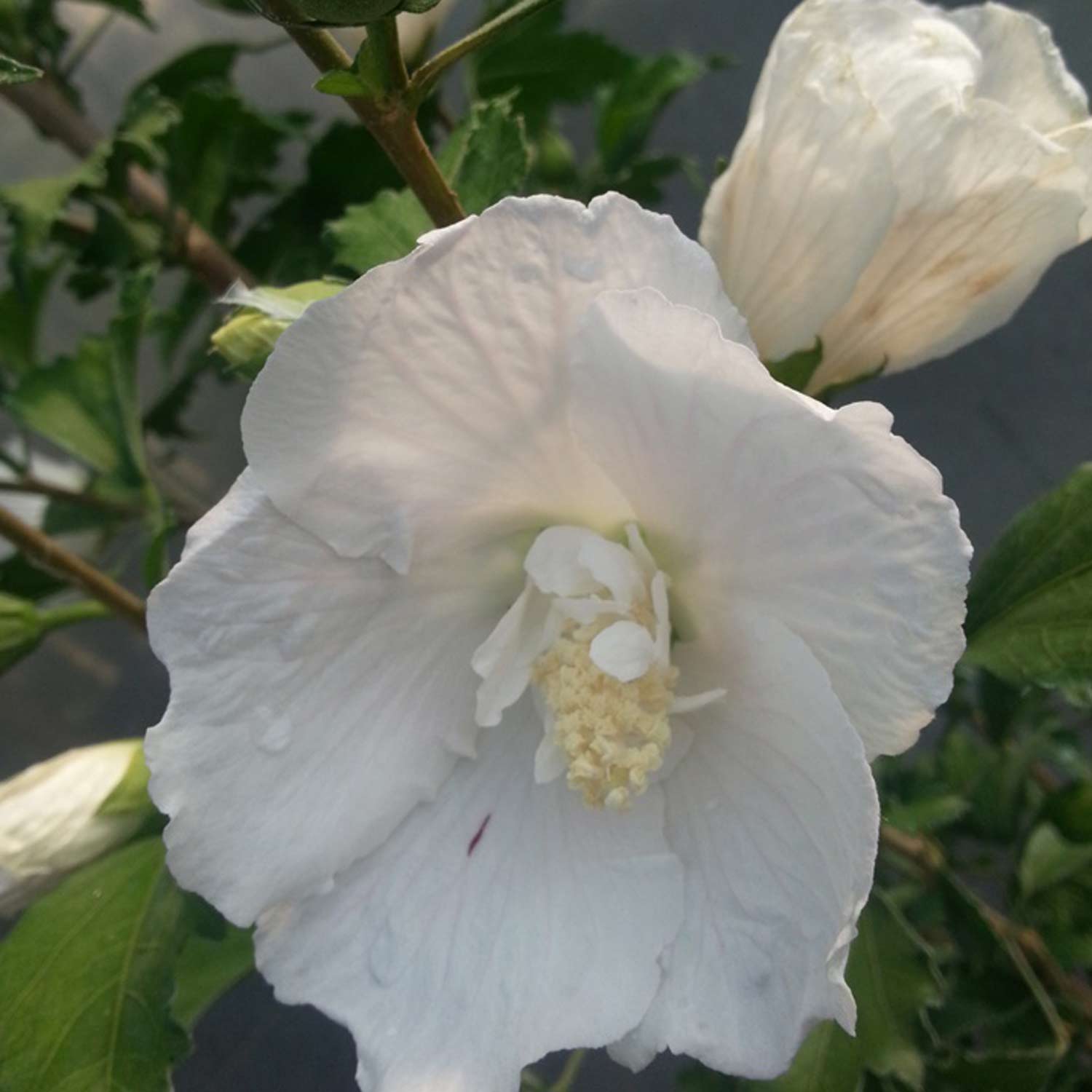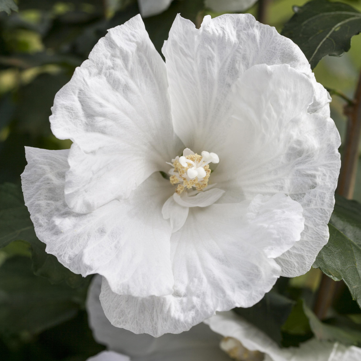 Die Blüten des 'White Pillar' überzeugen durch ihre schlichte Eleganz. Groß, offen und unverziert präsentieren sie sich in einem reinen Weiß, das in wunderschönem Kontrast zum dunkelgrünen, leicht gezackten Laub steht. Diese Kombination macht den Säulen-Eibisch zu einem echten Blickfang in jedem Garten.