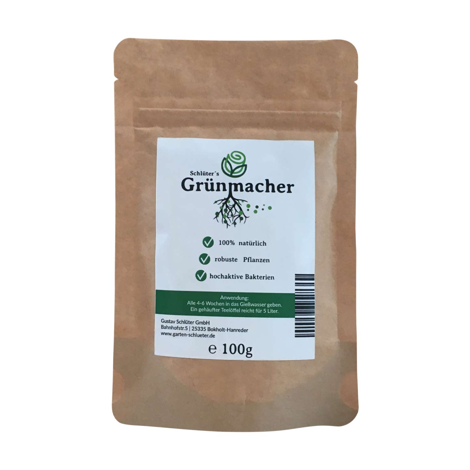 Schlüter's Grünmacher wurde zur Gesunderhaltung, Regeneration und Stärkung Ihrer liebsten Nutz- und Zierpflanzen entwickelt und besteht aus einer mikrobiologischen Mischung, die aus einer Vielzahl an Bakterienstämmen und natürlichen Stimmulatoren besteht. Schlüter´s Grünmacher übt einen positiven Einfluss auf alle Ihre Gartenpflanzen aus. Die Bakterien sorgen für eine optimale Gesundheit der Pflanzenzelle und machen die Pflanzen widerstandsfähiger gegen Schädlinge aller Art. Die Stimmulatoren und Trichoderma sorgen für ein optimales Feinwurzelwachstum Ihrer Pflanzen und damit auch für eine bessere Nährstoff-Aufnahme aus dem Boden. Der Grünmacher wird sowohl über die Blätter als auch über die Wurzeln aufgenommen und sorgt so, für ein gleichmäßiges und energisches Wachstum der Pflanze, sowie für eine intensivere Blütenbildung.
