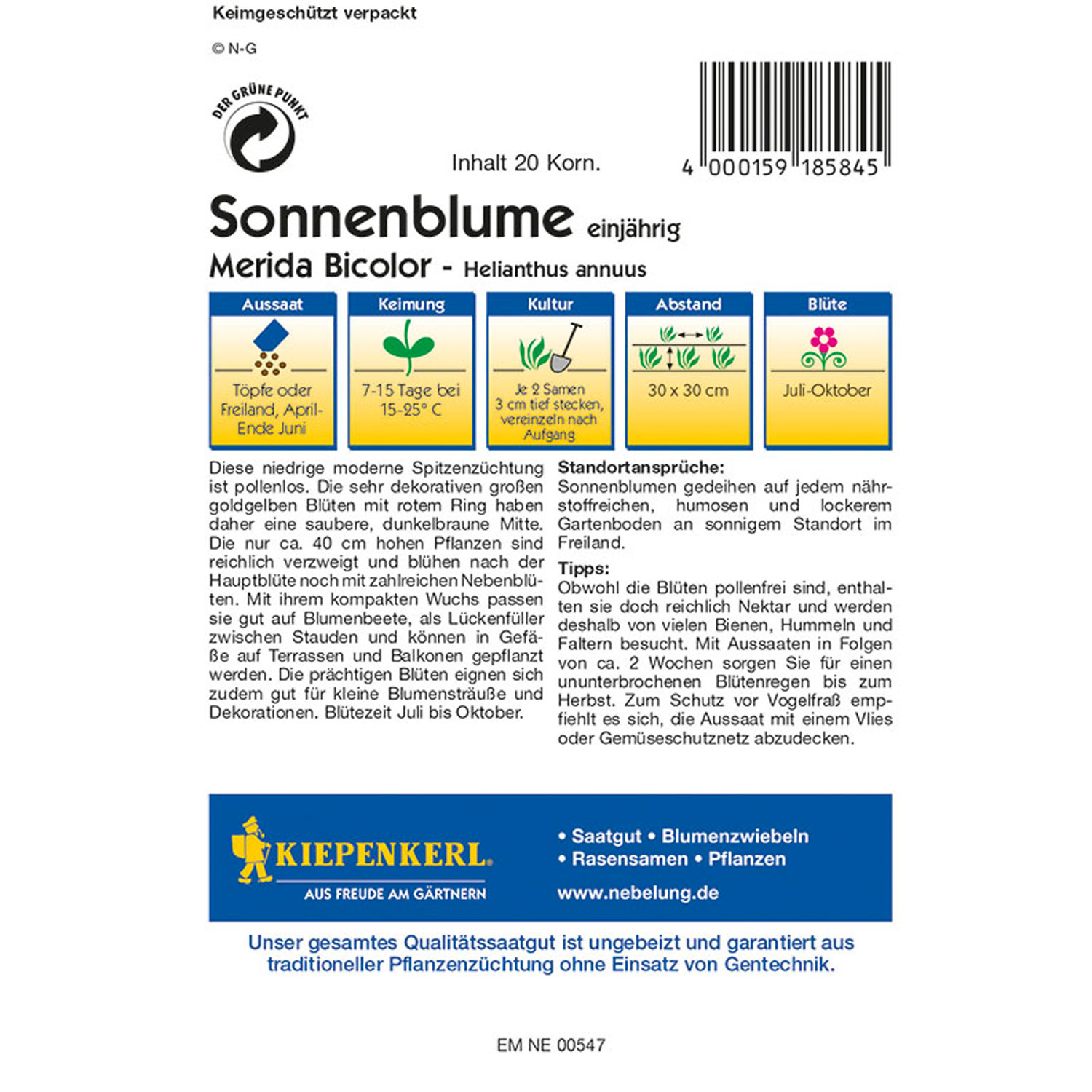 Diese Sonnenblume mit kompaktem Wuchs ist ca. 40 cm hoch und eignet sich deshalb auch für die Pflanzung in Kübeln. Auch als Schnittblume, um kleine sommerliche Blumensträuße zu binden, ist "Merida Bicolor" sehr beliebt.