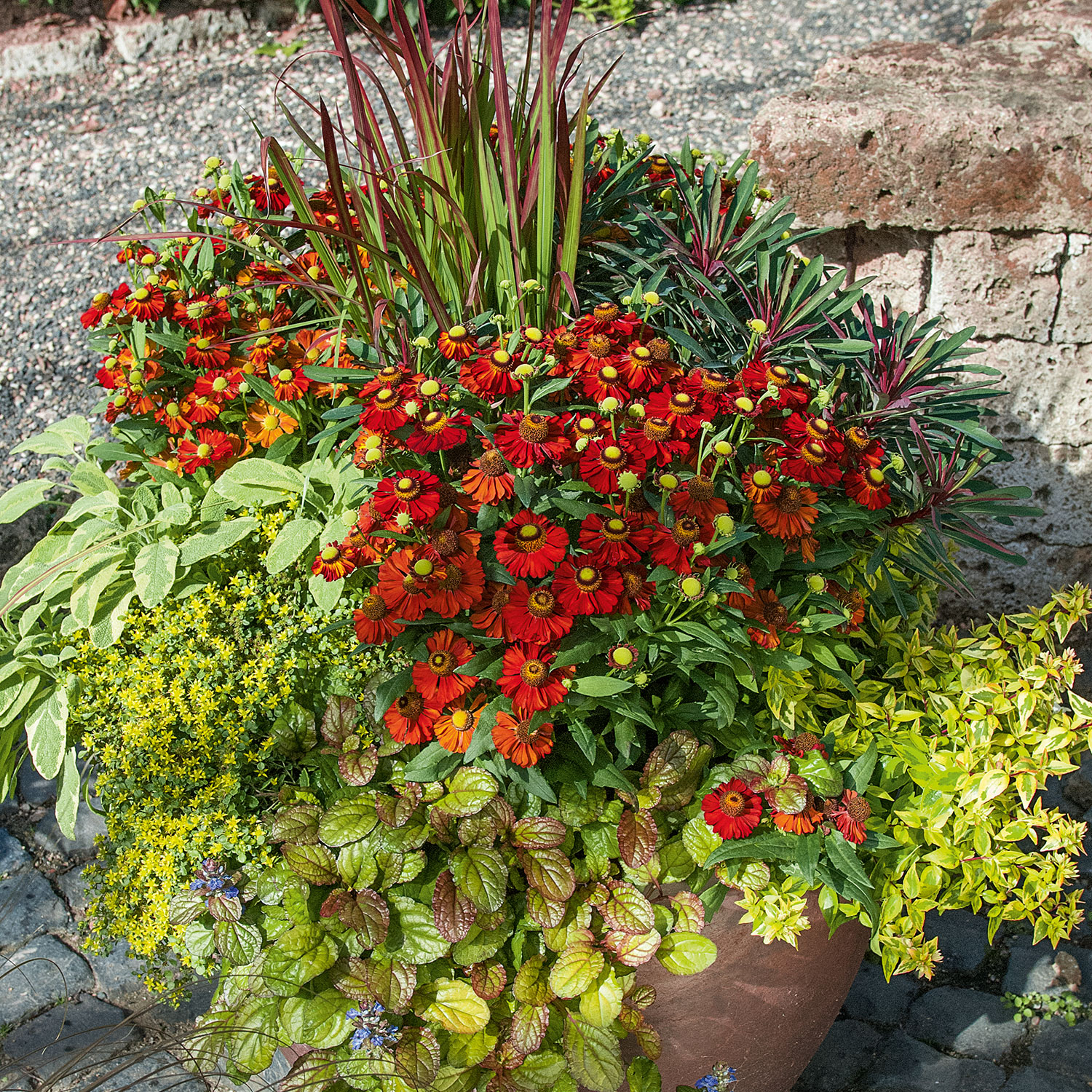 Die Sonnenbraut 'Helias Fire Red' eignet sich hervorragend für Pflanzkübel auf der Terrasse oder dem Balkon. Mit ihrer intensiven Blütenfarbe und der langen Blütezeit ist sie ein echter Hingucker und lässt sich gut mit anderen Stauden kombinieren. Besonders schön wirkt sie in Kombination mit anderen Sonnenbraut-Sorten, Astern oder Gräsern.