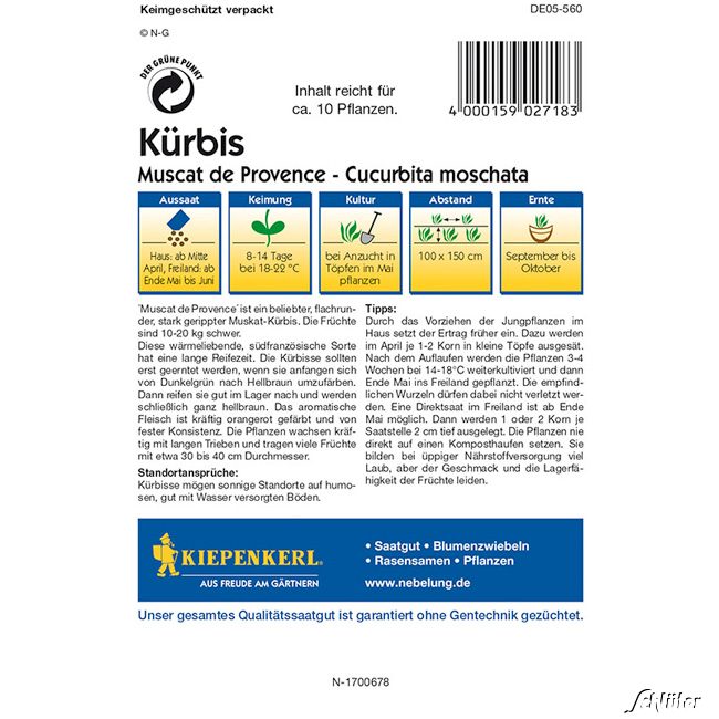 Dieser Speisekürbis reift erst im Spätherbst und entwickelt auch erst dann sein volles, kräftiges Aroma. Bis zum Frühjahr lassen sich die Früchte lagern (frostfrei).