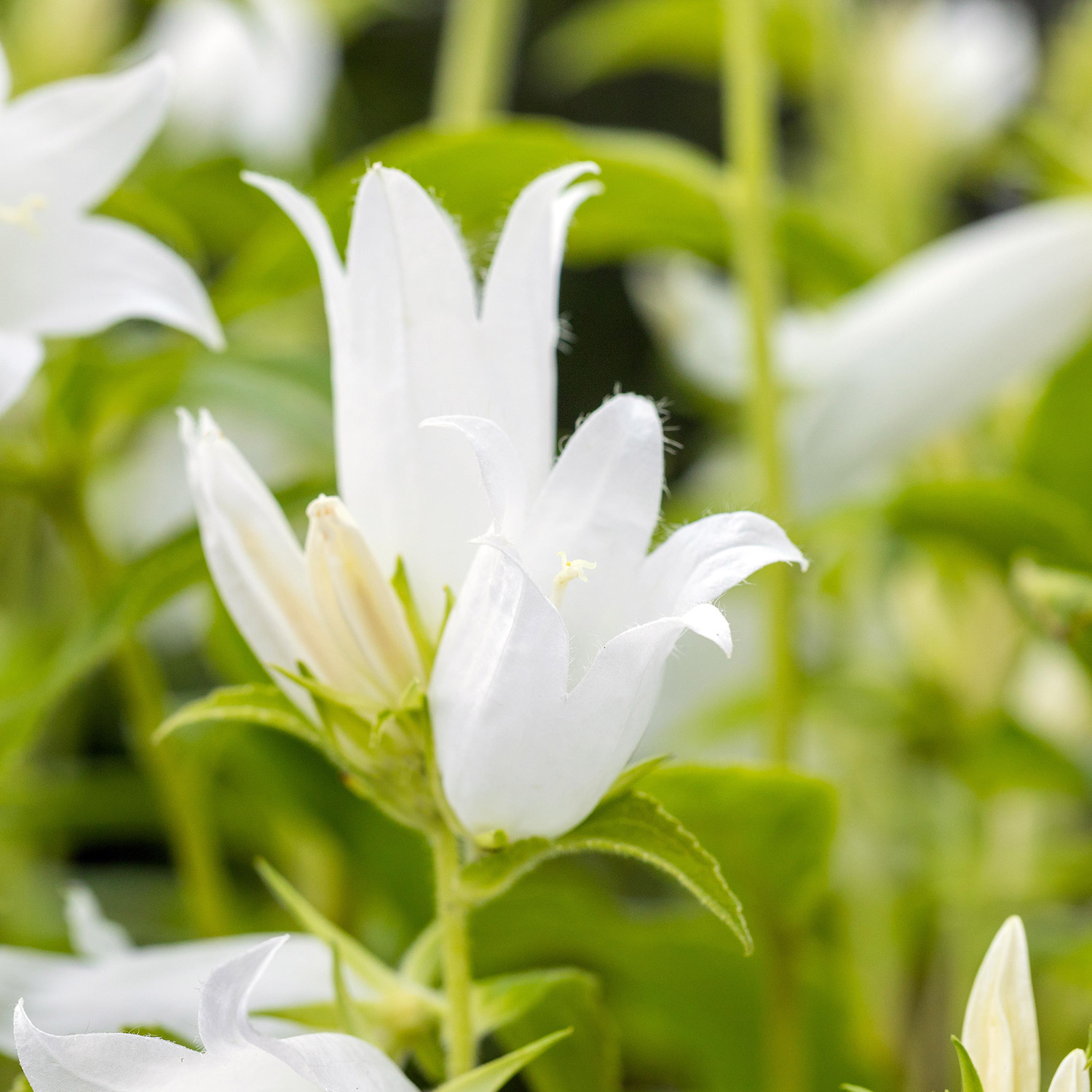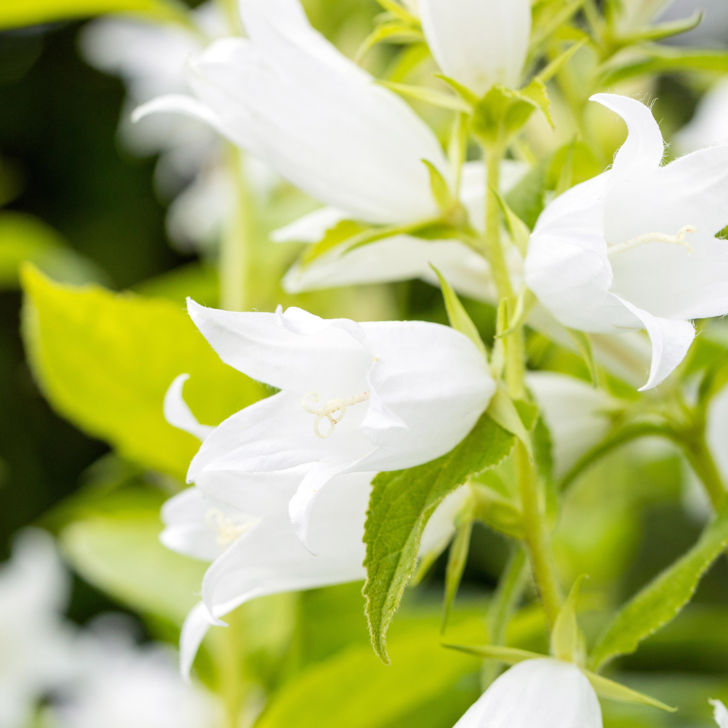 Schnell erhebt sie sich unter den richtigen Bedingungen bis zu einer Höhe von 1,20 m und wiegt sich munter vor Waldrändern, Holzzäunen, zwischen Gemüsebeeten, im Vorgarten oder direkt in Sitzplatz-Nähe. Die Wald-Glockenblume weiß kommt mit lichtem Schatten sehr gut zurecht und liebt frische und humose Böden. Auch lehmig-sandige Böden werden toleriert. Mit Gärtner-Glück beginnt die Blüte im Juni und dauert teilweise bis in den August hinein. Die aufrechten Blütentriebe streben den ganzen Sommer über munter in die Höhe und bilden einen wahren Glockenreigen, der auch zahlreiche nützliche Insekten, vor allem Bienen und Hummeln, anlockt. Die mittelgrünen Blätter sind lanzettlich und verstärken in ihrer Anordnung den aufrechten Charakter dieser wunderschönen Staude.