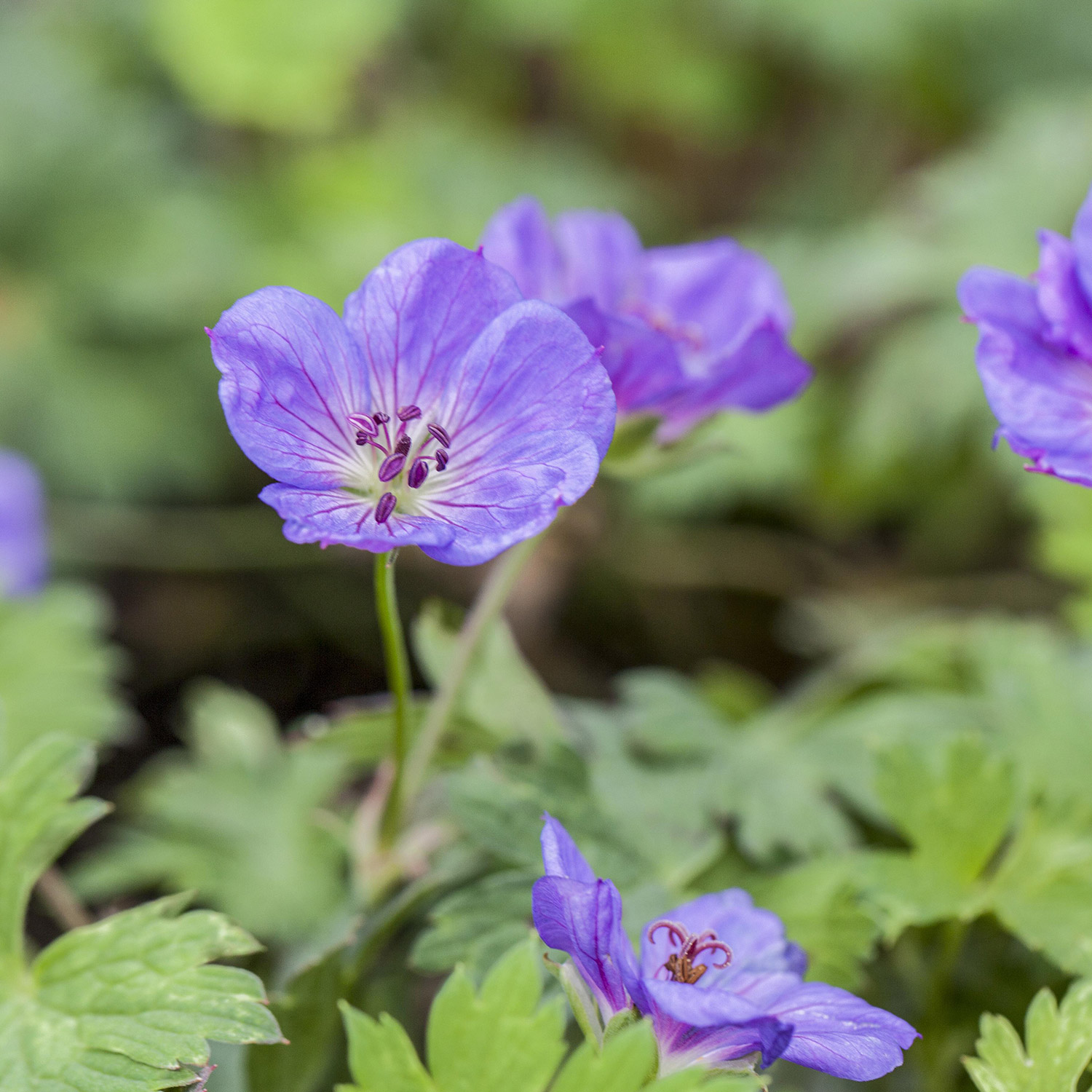 Die Blüten dieses außergewöhnlichen Storchschnabels sind violettblau und haben ein weißes Auge, wodurch sie schön strahlen. Die feinen Äderchen geben den Blüten eine schöne Tiefe.