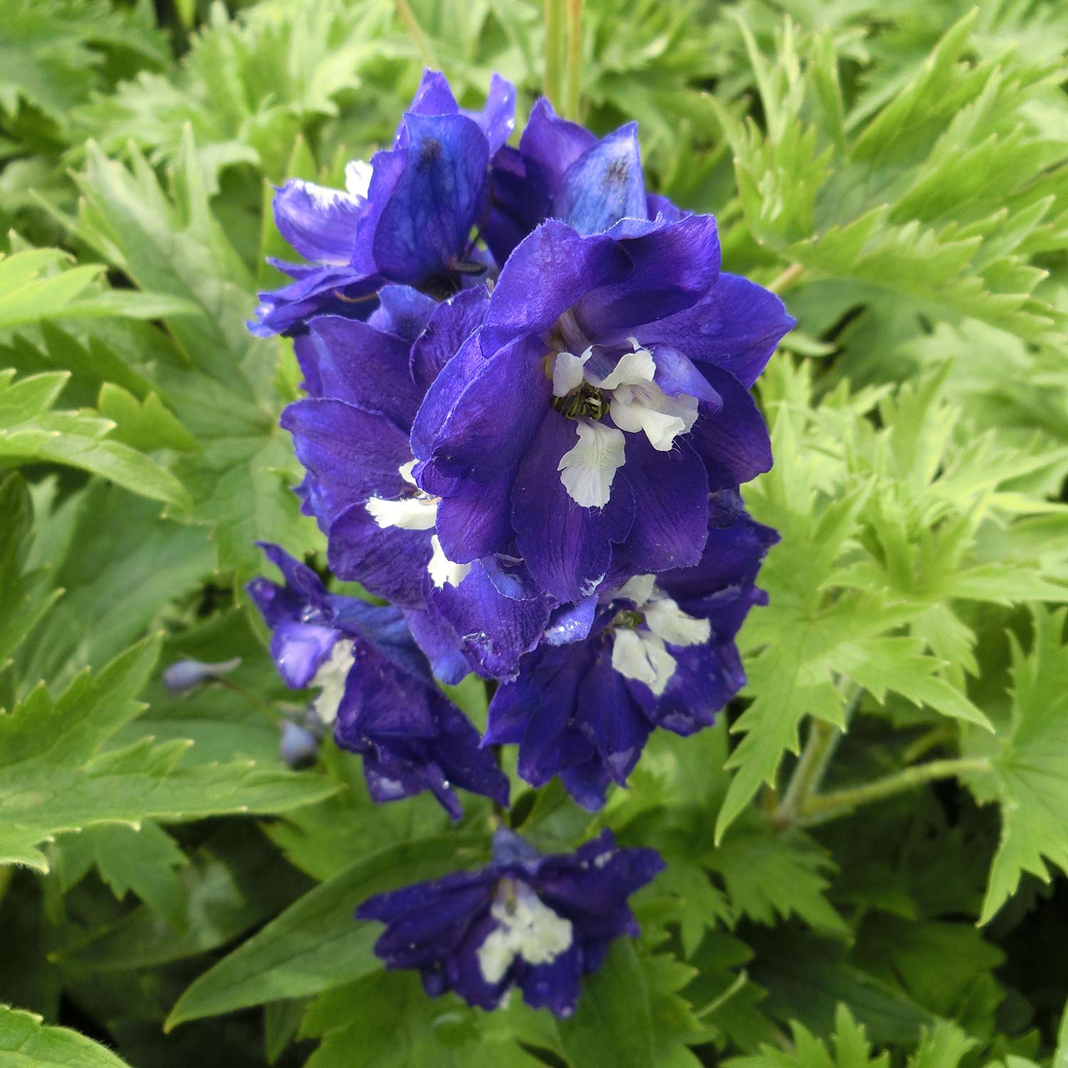 Die sommergrünen Blätter des Rittersporns sind mittelgrün, tief geschlitzt und gezähnt. Der kompakte Wuchs der Staude macht sie zu einem idealen Kandidaten für verschiedenste Pflanzungen im Garten oder in Kübeln.