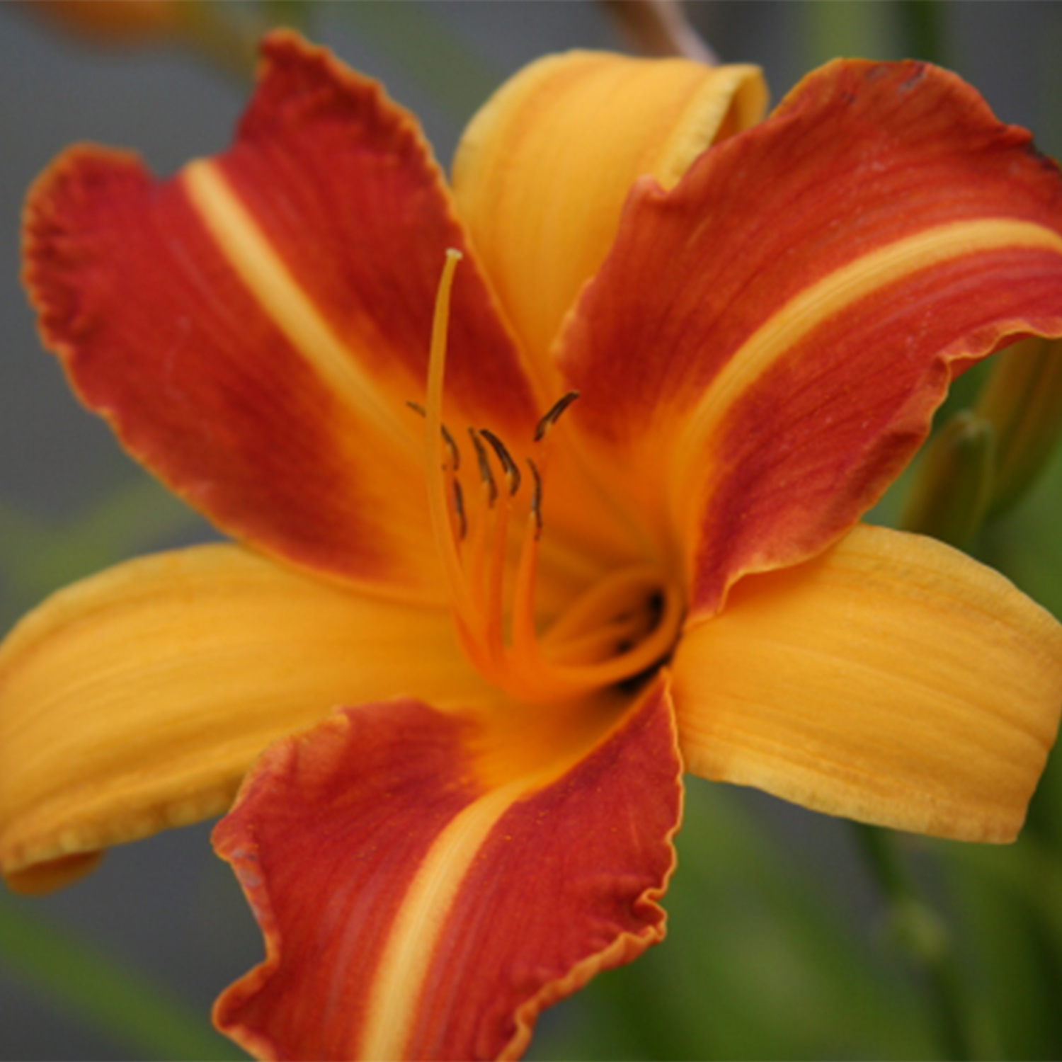 Die Taglilie "Frans Hals" gehört zu den seltenen zweifarbigen Taglilien. Ihre unteren Blütenblätter strahlen in einem sattem goldgelb, die oberen Blätter sind dunkelrot und haben einen gelben Mittelstrich.