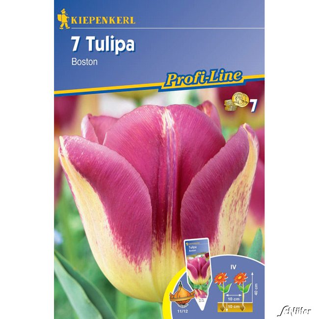 Die Triumph-Tulpe "Boston" kommt in den absoluten Trendfarben daher. Die Grundfarbe ist hellgelb und sie ist verziert mit einem breiten weinroten bis violetten Rand.