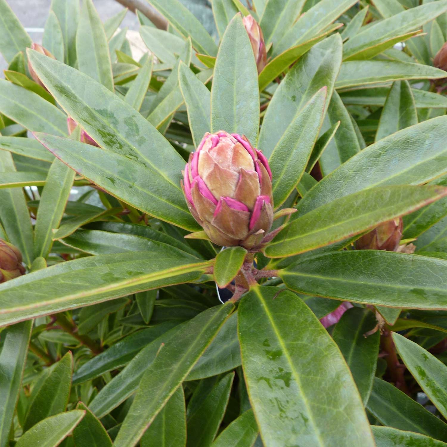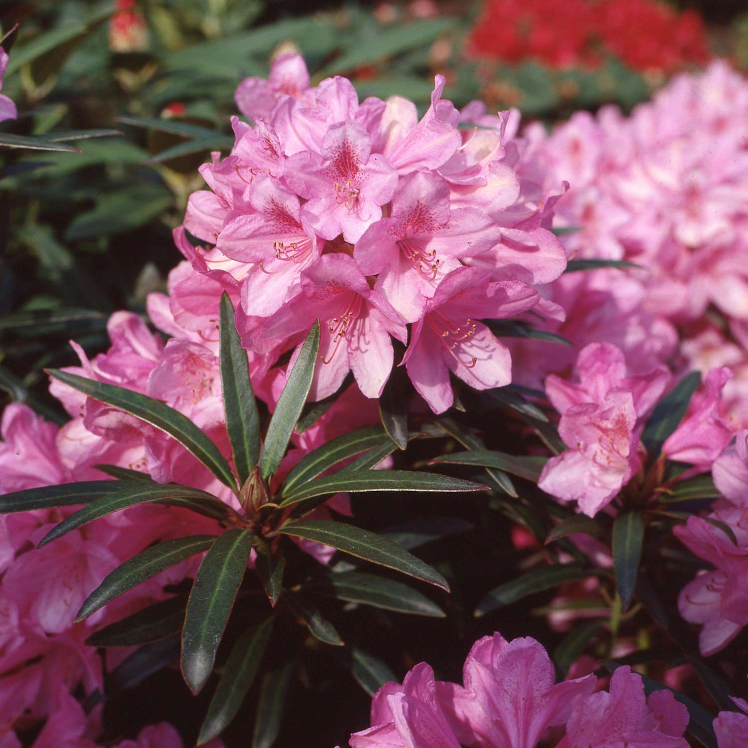 Der Wild-Rhododendron 'Graziella' ist ein beeindruckender Blickfang in jedem Garten, bekannt für seine großen rosa Blüten, die zwischen Mai und Juni erscheinen. Jede Blüte ziert ein markantes weinrotes Auge, das die Aufmerksamkeit auf sich zieht.