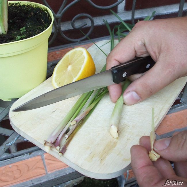 Zitronengras oder auch Lemongras genannt gehört zur Familie der Süßgrasgewächsen. Es kann circa zwei Meter hoch werden und hat eine knollige Wurzel. Es duftet und schmeckt deutlich nach Zitrone. Es erinnert im Aussehen an unsere Frühlingszwiebeln. Die Blätter sind lang uns spitz.