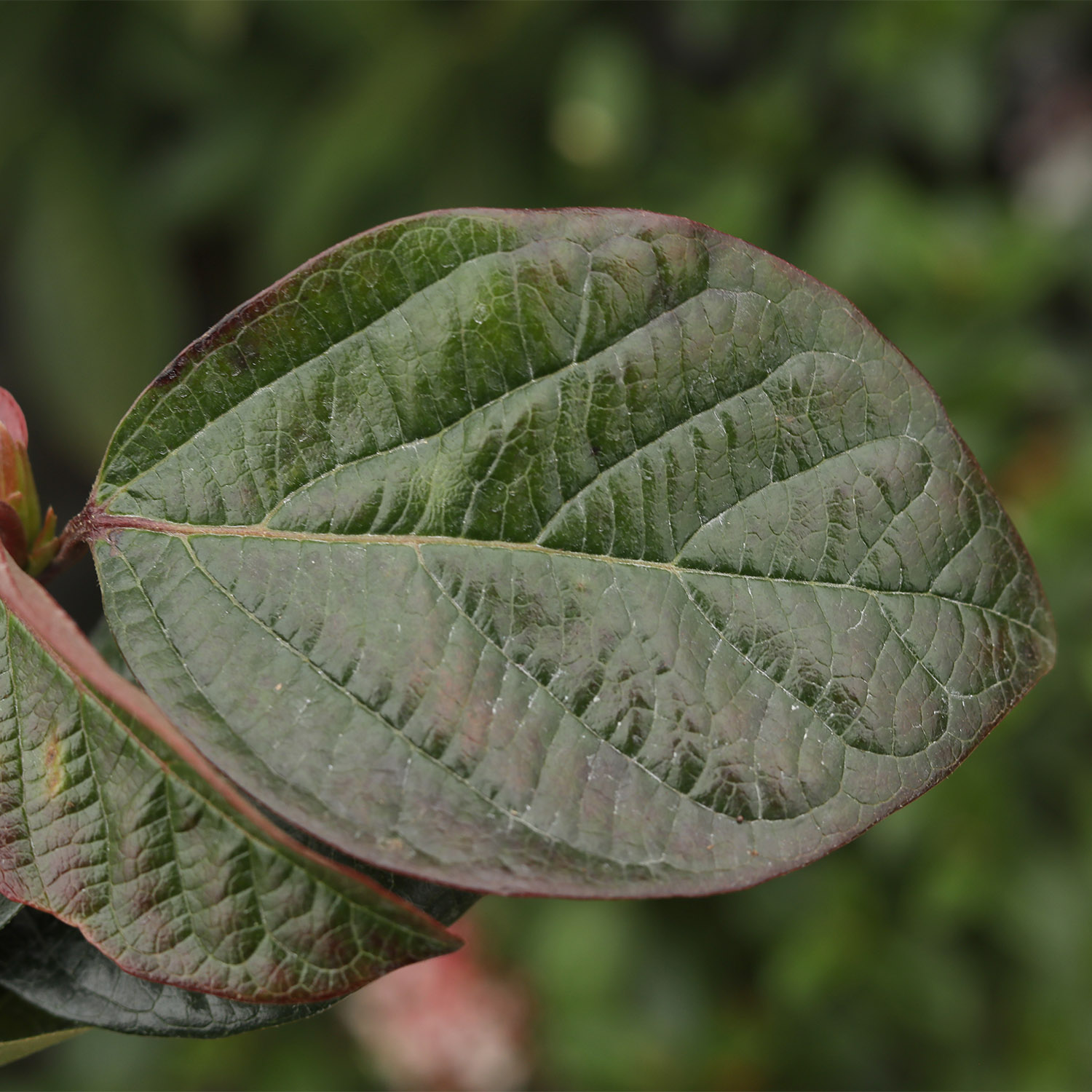 - rot umrandete, glänzende Blätter